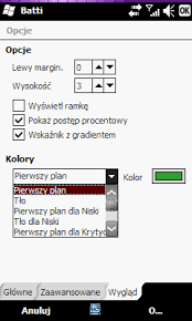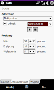 Program monitorujący stan baterii oraz wyświetlający szczegółowe informacje o niej. Potrafi określić stan akumulatora w procentach, jego typ, napięcie oraz temperaturę. Odczytuje również stan zapasowej baterii, jeśli taka istnieje. Przy jego pomocy można ustawić kiedy poziom energii jest krytyczny, o czym będziemy informowani poprzez sygnał dźwiękowy. screeny: Możliwość ustawienia różnych kolorów paska pokazującego stan baterii. Domyślnie, gdy telefon nie jest podłączony do ładowania, ustawiony jest kolor czerwony przechodzący w zieleń, a gdy urządzenie się ładuje, fioletowy - wszystko można zmienić; grubość paska, kolor, dźwięki odtwarzane, kiedy stan baterii jest niski, "zawsze na wierzchu" i jeszcze kilka innych opcji. Działa na wszystkich telefonach z systemem Windows Mobile (przynajmniej na tych, z którymi miałam do czynienia, tj. kilka najnowszych modeli htc i samsung omnia i900). Po wgraniu na telefon (gdziekolwiek) wystarczy zainstalować.