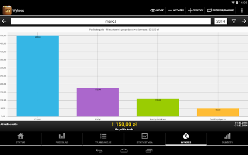 ✔ W statystykach można zobaczyć w formie tabeli lub graficznie, gdzie zostały pieniądze, poprzez kategoryzację wszystkich wpływów i wydatków.