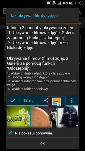 1) Encryption - ukryte zdjęcia nie są tylko przeniósł się do sekretnego miejsca, lecz są również szyfrowane przy użyciu zaawansowanych 128bit szyfrowanie AES. Oznacza to, że nawet jeśli ktoś udaje się ukraść karty SD i kopiowanie plików graficznych, nadal będą w stanie wyświetlać zdjęcia
