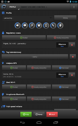 - przełączanie profilów wg Licznika czasu, Lokalizacji, Wydarzeń w kalendarzu i Bluetooth