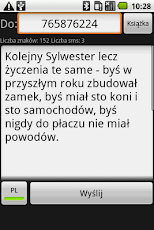Wysyłasz SMSy? A zdarzyło Ci się, że nie wiedziałeś co masz napisać? Szczególnie, gdy chciałeś komuś przesłać życzenia lub np. wyznać miłość? Teraz nie będzie z tym problemu! Aplikacja Super SMSy, to zbiór kilkuset przykładowych tekstów sms, pogrupowanych w kilkunastu kategoriach! Możesz wybrać dowolną kategorię (np. Urodziny, Imieniny, Sylwester), przejrzeć listę tekstów, wybrać odpowiedni tekst i wysłać go bezpośrednio na numer z książki telefonicznej. Dzięki temu, że aplikację będziesz miał zawsze przy sobie, napisanie fajnego smsa z np. z życzeniami nie będzie żadnym problemem!