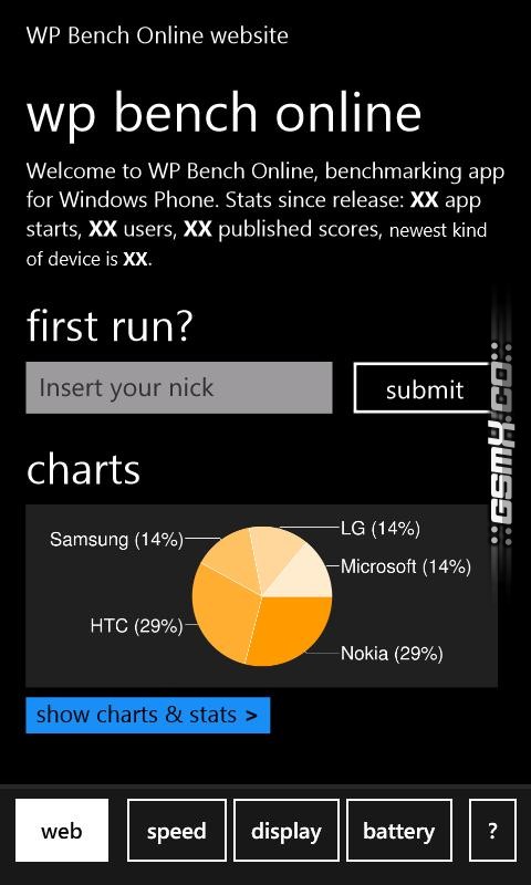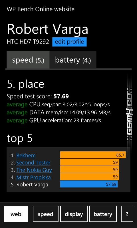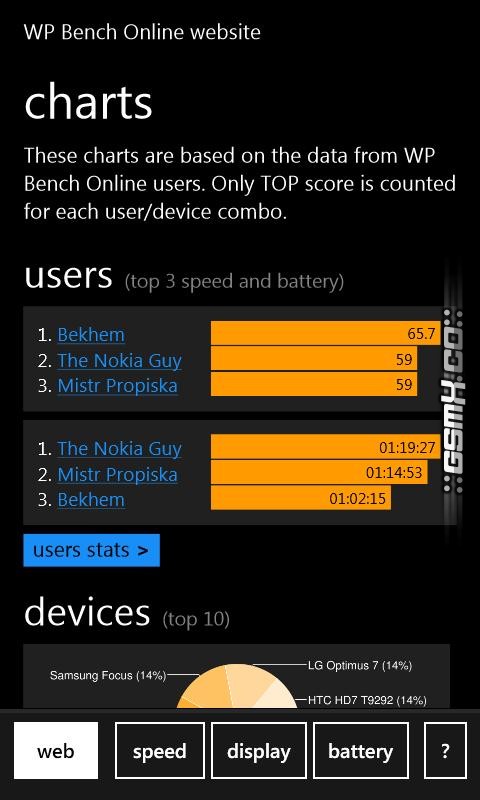 WP Bench is performance benchmark for Windows Phone 7 devices. It tests your CPU, GPU, memory, storage, display and battery and allows you to publish your score to the online charts or compare with the others.